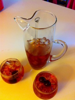 Add all spirits to a cocktail pitcher (multiply quantities by the number of drinks desired) filled with ice. Stir until chilled and ice forms on the glass. Pour over iced rocks glass and add two cherries and a half a spoonful of the cherry bounce. It’s not part of the official recipe, but somehow always gets in there